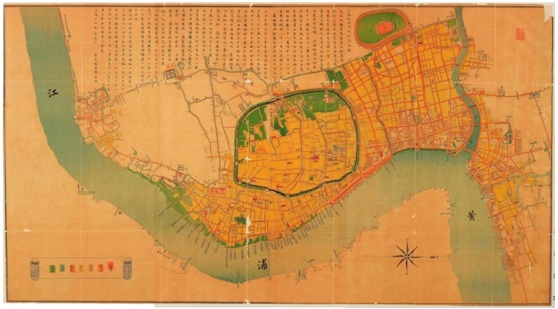钟翀(右)钟教授认为,上海能够发展的宏观因素有以下三点:第一,襟江带海,一面面临长江,一面面朝太平洋,上海具有得天独厚的发展空间。第二,腹地广阔,从长江流域来讲,上海腹地约180万平方公里,拥有4亿人口,是亚热带季风带气候,条件优越。第三,欧米中点,在金融的八小时时间带上,上海依然具有优势。所以一个城市的发展不是偶然的。从中观层面讲,上海位于长江口三角洲,经济规模大、历史悠久。同时,钟教授强调,长江三角洲是资本密度最大的地带,特别是沿江、沿海、能够开展远洋贸易的三角洲。那么,上海究竟是怎么成长起来的?钟翀教授对此作了梳理。宋朝,古吴淞江逐渐淤塞,外来船舶改由“上海浦”进入上海,最早停靠在今十六铺从新开河到大小东门一带,日久天长,居民聚居,形成了上海早期的集镇聚落。11世纪,第一次出现用以收酒税的“上海务”,是一个很重要的机构。过了一百多年,“上海镇”成立,并且在镇内设置了针对海外贸易的“市舶分司”。13世纪末,成立“上海县”,并一度设“市舶司”。明嘉靖32年,因为倭寇几次进城,上海的城墙、城壕完成。清道光23年,据《南京条约》开港。1845年,英租界成立,其后,美租界(1848)、法租界(1849)相继设立。1853~1862年,因为太平天国之乱、难民涌入,上海总人口达到50万。1918~1937年,上海进入全盛期。1936年,上海达到最盛期,其时租界150万人,租界以外200万人,为当时全国最高的人口过密都市。1945年,日本败战,上海返还国民政府。1949年,解放军入城,上海近代史终焉。地图上的近代上海之变
