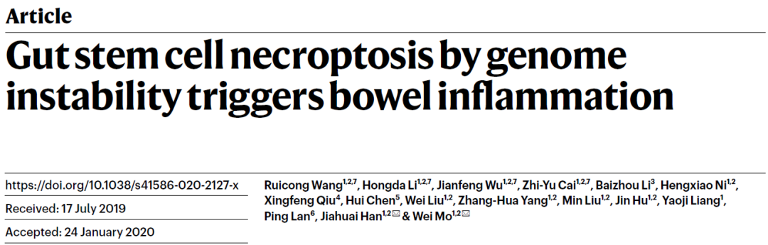 2020年3月25日,细胞应激生物学国家重点实验室,厦门大学生命科学学院莫玮教授课题组和韩家淮院士课题组合作在Nature杂志上发表题为“Gut stem cell necroptosis by genome instability triggers bowel inflammation”的研究文章,报道了肠道干细胞中基因组不稳定激活ZBP1-RIP3-MLKL轴引发干细胞坏死,导致自发性的肠道炎症。