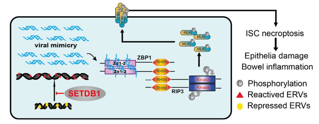 在坏死样凋亡中,RIP1和RIP3,RIP3和RIP3间通过两者共有的RHIM结构域相互结合。ZBP1是另外一个具有RHIM结构域的蛋白。之前的工作发现少数病毒,比如流感病毒IAV,小鼠巨细胞病毒(MCMV)可以通过ZBP1激活坏死。在非感染情况下,ZBP1介导的坏死只有在RIP1 RHIM结构域突变的小鼠上发现11,但是其生物学意义和机制仍是未知。3月17号的cell杂志报道了IAV激活ZBP1起始坏死的具体机制。Siddharth课题组发现 IAV产生的ZRNA是促发坏死的死亡信号12。 本文作者通过对转录组的KEGG分析,发现在Setdb1敲除的肠干细胞中,有大量类病毒的积累。通过对结合在ZBP1上的核酸进行测序分析,发现这些核酸是ERV RNA。ZBP1的N端有结合核酸的结构域,如果将此结构域剔除,Setdb1敲除导致的肠干细胞死亡可被抑制。由此,作者认为,Setdb1的缺失使得ERV重新活跃,破坏了基因组的稳定性,大量积累的ERV RNA作为死亡信号,结合并激活ZBP1启动坏死样凋亡。